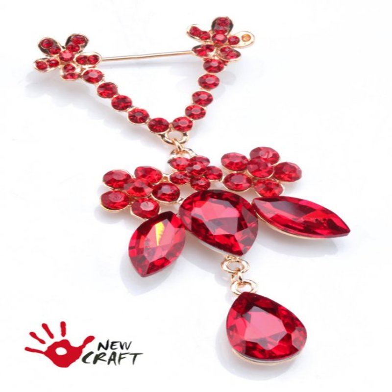 Piękna, klasyczna broszka wisząca w kolorze złota z cyrkoniami. Ozdoba zakończona solidnym zapięciem agrafka. Idealny pomysł na prezent, biżuteria gotowa. KOD TOWARU: ID - DS Wielkość kryształków: od 2,8mm do 18mm Kolory broszki: złoty Kolor kryształów: czerwony
