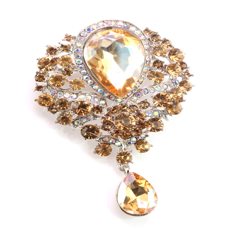 Piękna, klasyczna broszka w kolorze złota z cyrkoniami. Ozdoba zakończona solidnym zapięciem agrafka. Idealny pomysł na prezent, biżuteria gotowa. KOD TOWARU: ID - DS Wielkość kryształków: od 3,4mm do 17mm Kolory broszki: złoty Kolor kryształków: Jasny miodowy