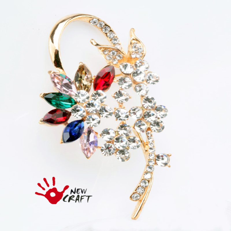 Efektowna broszka w kształcie KWIATU, wysadzana cyrkoniami w różnych kolorach. Ozdoba zakończone solidnym zapięciem agrafka. Idealny pomysł na prezent, biżuteria gotowa. Rozmiar kryształów: od 3mm do 5mm Długość całkowita 60mm. Kolory podstawy broszki: złoty Kolor kryształków: mix