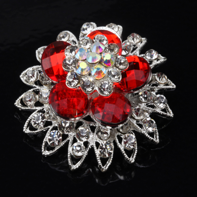 Elegancka broszka z motywem kwiatowym. Broszkę zdobią kryształki w kolorze białym, a płatki wykonane są z kolorowych serc. Ozdoba zakończone solidnym zapięciem agrafka. Idealny pomysł na prezent, biżuteria gotowa. Rozmiar kryształów: do 13mm Kolory podstawy broszki: srebrny Kolor kryształków: mix