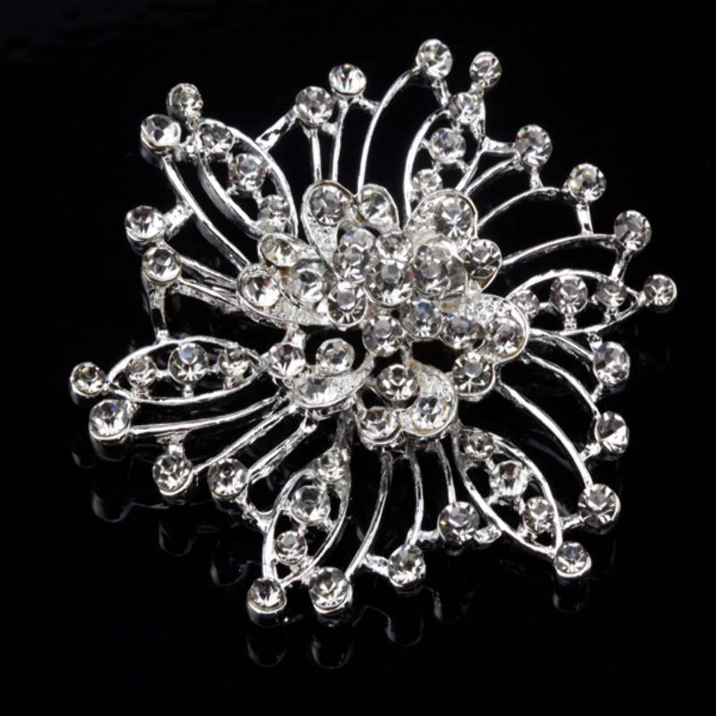 Bardzo ładne broszki w srebrnym kolorze z mieniącymi się kryształkami. Każda sztuka różni się od siebie nieznacznie wzorem. Idealny pomysł na prezent, biżuteria gotowa Wielkość kryształków: od 2,8mm do 5,5mm Kolory: srebrny Kolor kryształków: bezbarwne KOD TOWARU: ID - DS