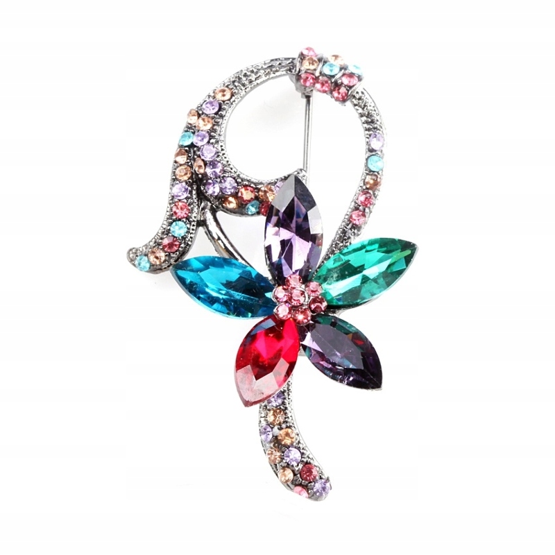 Efektowna broszka VINTAGE, wysadzana cyrkoniami. Broszka z centralnymi cyrkoniami i dodatkami w kształcie kwiatu. Ozdoba zakończone solidnym zapięciem agrafka. Idealny pomysł na prezent, biżuteria gotowa. Rozmiar kryształów: od 3,5mm do 5,4mm Długość całkowita 49mm. Kolory podstawy broszki: srebrny Kolor kryształków: mix