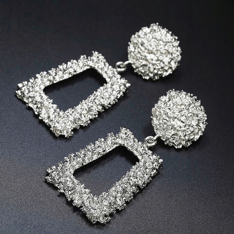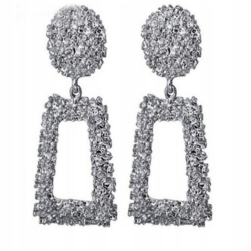 Opis: Długie kolczyki geometryczne w kolorze srebrnym, bigle typu sztyft. Biżuteria gotowa