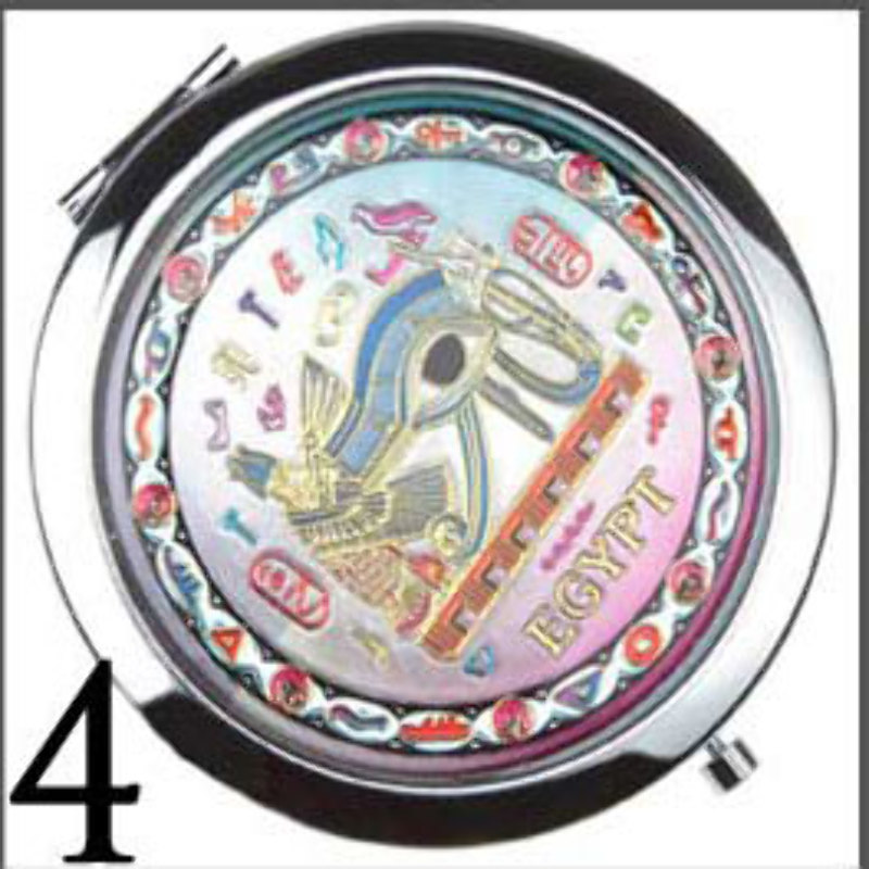 Stylowe kompaktowe PODWÓJNE LUSTERKO - wykonane ze stali (zamykane na automatyczny zatrzask) z pięknym i modnym wzorem na przodzie (motyw przewodni - EGIPT). Po otwarciu na dolnej stronie znajdziesz lusterko POWIĘKSZAJĄCE. UNIKAT! - piękny i niezbędny przedmiot, idealny do każdej kobiecej torebki! Elegancja w doskonałej cenie!