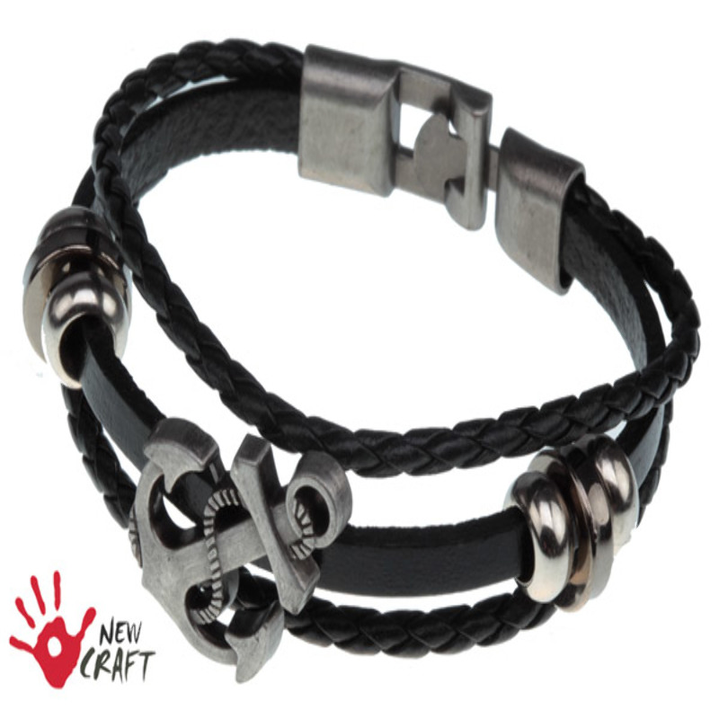 Bardzo ładna bransoletka męska wykonana z rzemienia z elementem ozdobnym (kotwica) zamieszczonym centralnie oraz zapięciem w kolorze ciemnego srebra - wysoka jakość i modny wzór. Biżuteria gotowa.