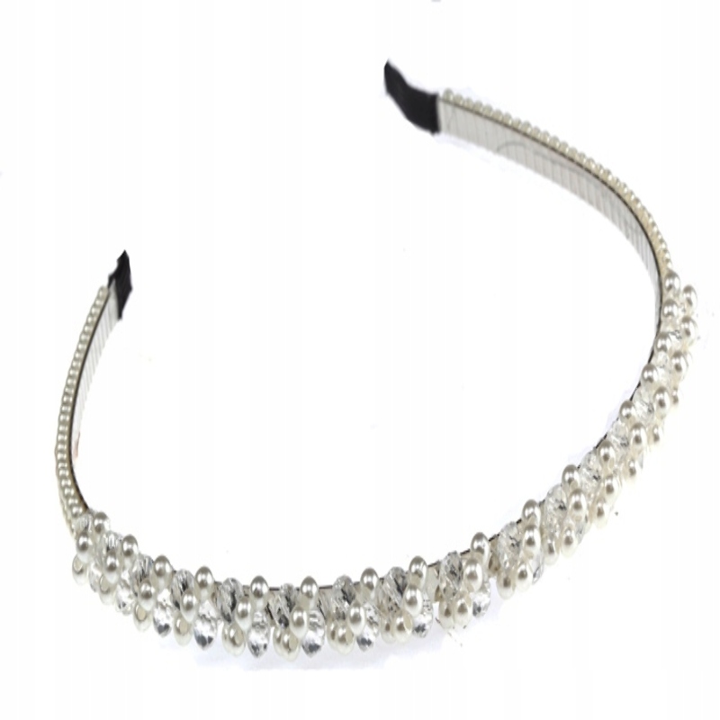 Opaska zdobiona białymi perelkami i bezbarwnymi kryształkami.