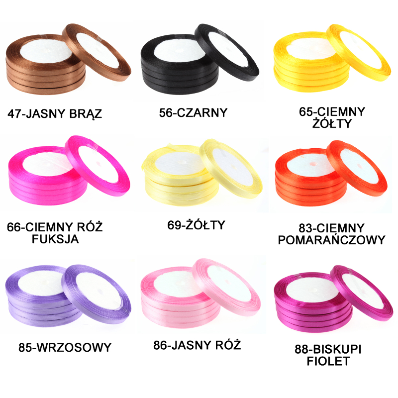 1 ZESTAW - 10 ROLEK Szerokość: 6mm Kolor: MIX 1 ROLKA - 22 metry Opis: Bardzo elegancka tasiemka satynowa - sprzedawana na rolkach. Idealnie nadaje się do dekoracji kartek okolicznościowych, zaproszeń, kwiatów, styropianu oraz różnego rodzaju stroików. Po dokonaniu zakupu proszę o podanie jakie kolory tasiemek spakować. Brak informacji spowoduje opóźnienie wysyłki.
