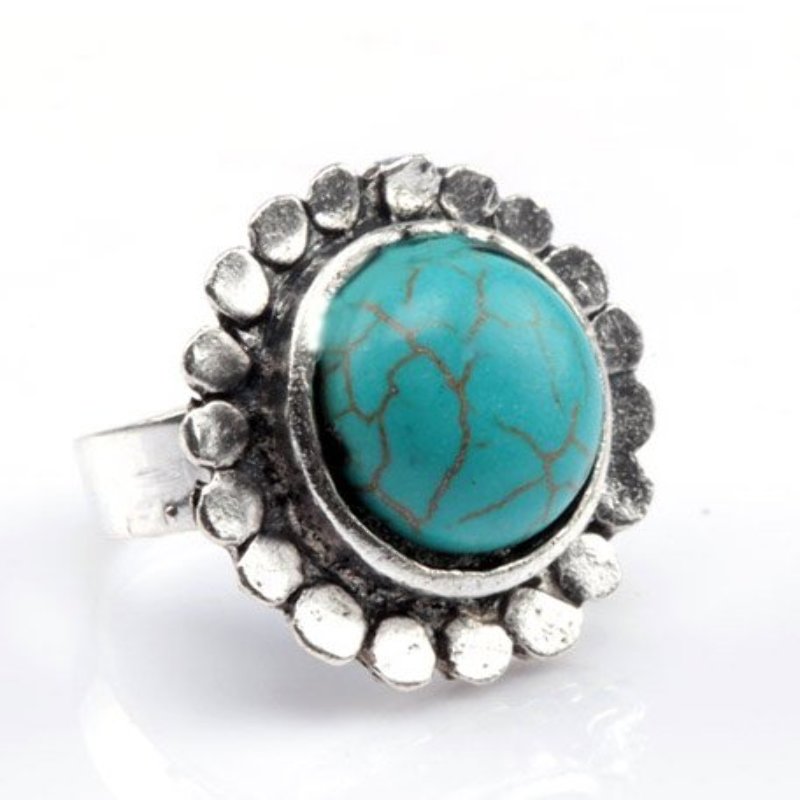 Bardzo ładny PIERŚCIONEK metal - SREBRO TYBETAŃSKIE z oczkiem (kaboszon z kamienia - HOWLIT w kolorze TURKUSU). Pierścionek dopasowuje się do wielkości palca. Idealny na prezent! BIŻUTERIA GOTOWA!