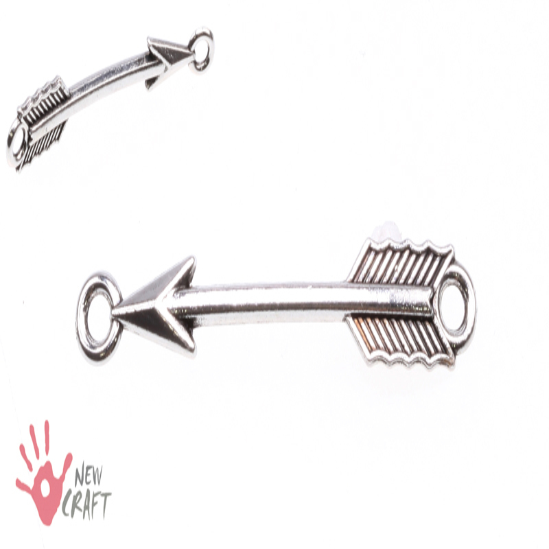Element ozdobny bali w formie łącznika o srebrnym kolorze w kształcie STRZAŁY. Produkt antyalergiczny, nie zawiera niklu ani ołowiu, przeznaczony do wyrobu biżuterii.