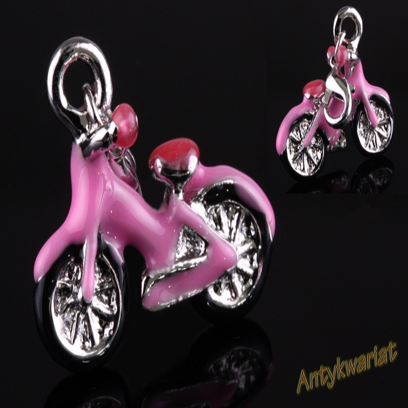 Bardzo ładny element ozdobny - ZAWIESZKA CHARMS MAX 3D - MAKSYMALNY TRÓJWYMIAR - w kształcie ROWERU . Element jest w kolorze SREBRNYM, częściowo pokryty KOLOROWĄ EMALIĄ. Zawieszka posiada zapięcie - KARABIŃCZYK - dobrze ukazane w miniaturce w rogu zdjęcia! Produkt nie zawiera niklu ani ołowiu - antyalergiczny! KOLOR: SREBRNY / RÓŻOWY / CZARNY