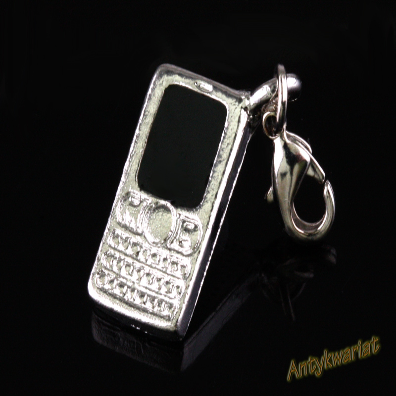Bardzo ładny element ozdobny - jednostronny - 3D - ZAWIESZKA CHARMS w kształcie TELEFONU KOMÓRKOWEGO. Element jest w kolorze SREBRNYM, z kolorową emalią na powierzchni. Zawieszone na zapięciu KARABIŃCZYK! Produkt nie zawiera niklu ani ołowiu - antyalergiczny! KOLOR: SREBRNY / CZARNY