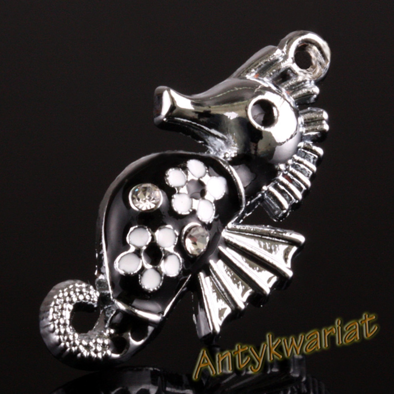 Bardzo ładny element ozdobny - jednostronny - charms - w formie konika morskiego. Element w kolorze srebra pokrytego kolorową emalią z błyszczącymi kryształkami - do zawieszki wystarczy dołączyć zapięcie np. karabińczyk. Produkt nie zawiera niklu ani ołowiu - antyalergiczny! KOLOR SREBRNY / CZARNY / BIAŁY