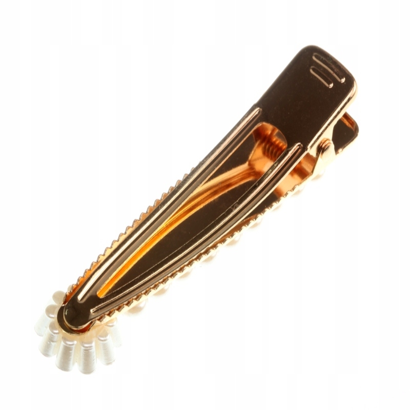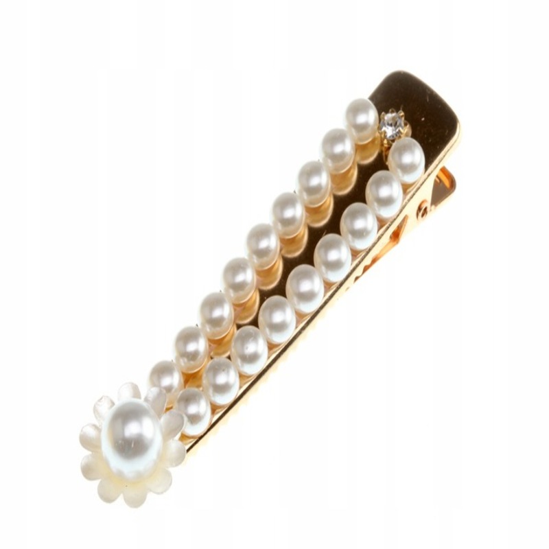 Opis: Piękna biżuteryjna spinka do włosów z perełkami. Baza spinki wykonana z mocnego metalu w złotym kolorze. Spinka bardzo elegancko prezentuje się na włosach długich jak i krótkich.
