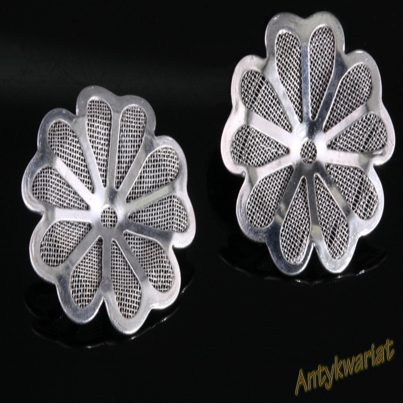Element ozdobny KWIATEK z metalową siateczką, wykonany z MIEDZI w kolorze CIEMNEGO SREBRA; do wyrobu biżuterii. Otwór montażowy (usytuowany pośrodku) wymaga przedziurawienia. Produkt NIE ZAWIERA niklu ani ołowiu!