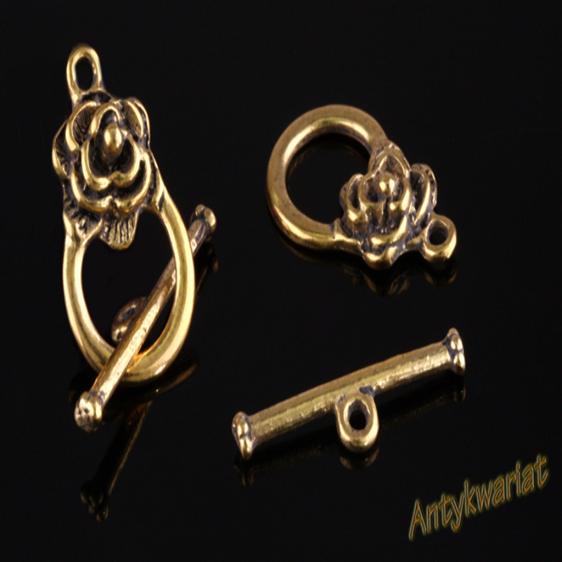 Opis:Zapięcie metalowe składające się z dwóch części w kolorze STAREGO ZŁOTA wykonane z MIEDZI. PRODUKT ANTYALERGICZNY - NIE ZAWIERA NIKLU ANI OŁOWIU; do wyrobu biżuterii.