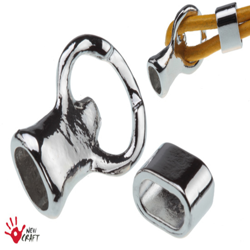 Zapięcie BALI składające się z dwóch części o jednakowych otworach na rzemienie. W rogu zdjęcia przedstawiono propozycję użycia zapięcia. PRODUKT ANTYALERGICZNY - NIE ZAWIERA NIKLU ANI OŁOWIU; do wyrobu biżuterii.