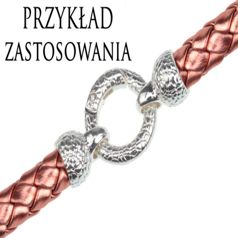 Zapięcie METALOWE TRZYCZĘŚCIOWE do rzemieni. Zapięcie składa się z dwóch grubych końcówek do rzemieni oraz solidnego łącznika. Produkt przeznaczony do wyrobu biżuterii. Poniżej umieszczono zdjęcie ilustrujące przykładowe zastosowanie zapięcia.